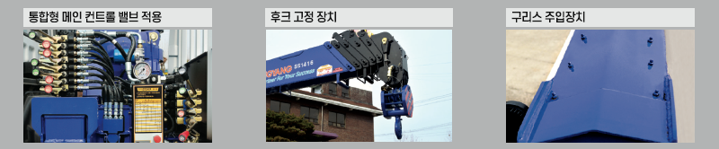 *안전장치:과부하 방지장치,권과방지장치,경보장치,후크해지장치,비상정지장치,스윙브레이크,원치 브레이크,실린더카운터 밸런스 밸브,아우트리거 파일럿 체크밸브