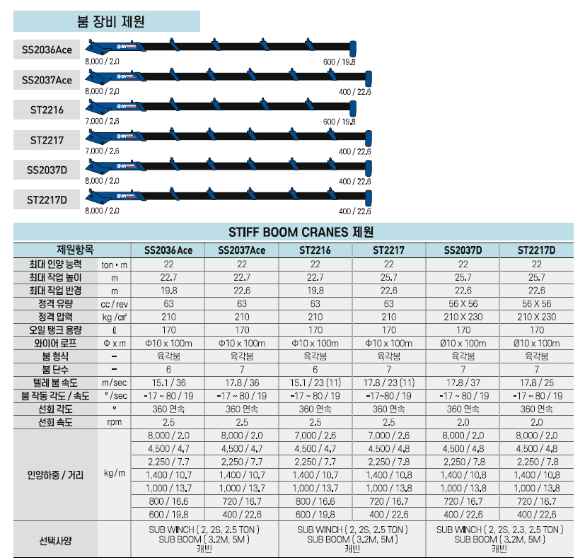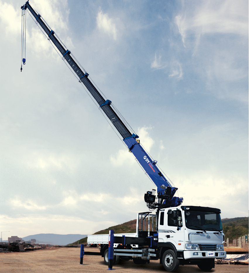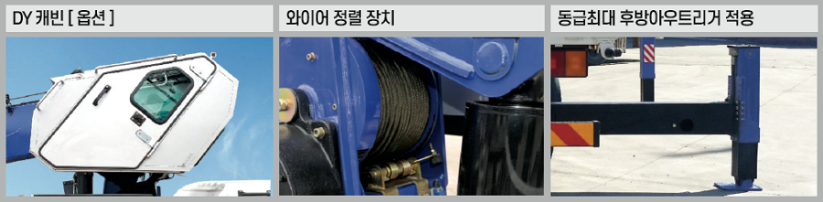 *안전장치:과부하 방지장치.권과 방지장치, 경보장치, 후크 해지장치, 비상 정지장치, 스윙 브레이크, 원치 브레이크, 실린더 카운터 밸런스 밸브,아우트리거파일럿 체크밸브, AML SYSTEM