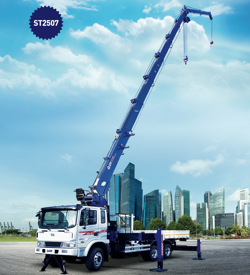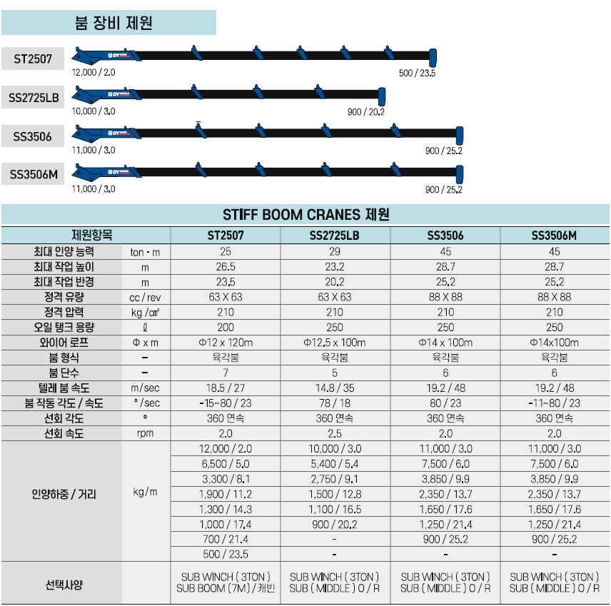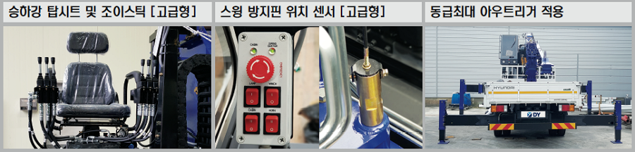 *안전장치:과부하 방지장치.권과 방지장치, 경보장치, 후크 해지장치, 비상 정지장치, 스윙 브레이크, 원치 브레이크, 실린더 카운터 밸런스 밸브,아우트리거파일럿 체크밸브, AML SYSTEM